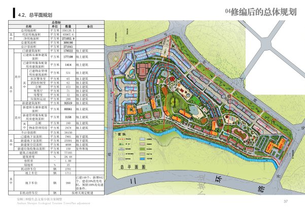 调整后规划方案主要经济技术指标:总用地面积356120.50㎡(代征代拆代建防护绿地34426.70㎡、代征代拆代建广场4180.50㎡、代征代拆代建河道13642.20㎡、代征代拆代建道路32818.20㎡、净用地面积271052.9㎡),总建筑面积309190㎡,其中地上建筑面积275939㎡[地上计容建筑面积271041㎡(娱乐康体面积266469㎡、物业管理用房3509 ㎡、社区警务室65㎡、消防控制室62㎡、公厕面积633㎡、售票厅71㎡、母婴室32㎡、垃圾转运点200㎡)、地上不计容建筑面积4898㎡(架空层4698㎡、垃圾收集站150㎡)],地下建筑面积33302㎡(全部不计容、车库及设备用房),容积率1,建筑密度28.48%,绿地率35%,停车位2701辆(地上1711辆、地下990辆)。