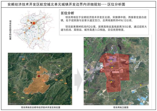 航空城北单元位于安顺经济技术开发区北部,宋旗镇中部,西接普定县白岩镇,处于迎宾路与安普大道交叉口。距黄果树机场约2公里,距离高铁站直线距离为5公里,通过迎宾大道与机场、高铁站、城市高速入口相连,规划单元总面积为416.12公顷,其中位于城镇开发边界内用地面积为185.29公顷。